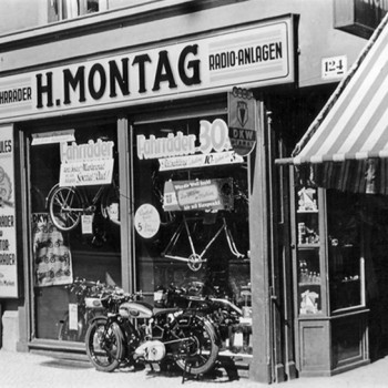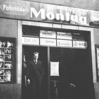 Der Kaufmann Heinrich Montag (geb. 23.10.1906) gründete am 23.09.1926 sein Geschäft für Fahrräder, Motorräder und Nähmaschinen in der Braunschweiger Straße im Haus der Palast-Lichtspiele. Auf der gegenüberliegenden Straßenseite befand sich seine Werkstatt. Bis Ende der 90er Jahre war der Werbe-Schriftzug noch auf dem Gebäude zu lesen, welches heute leider abgerissen ist.